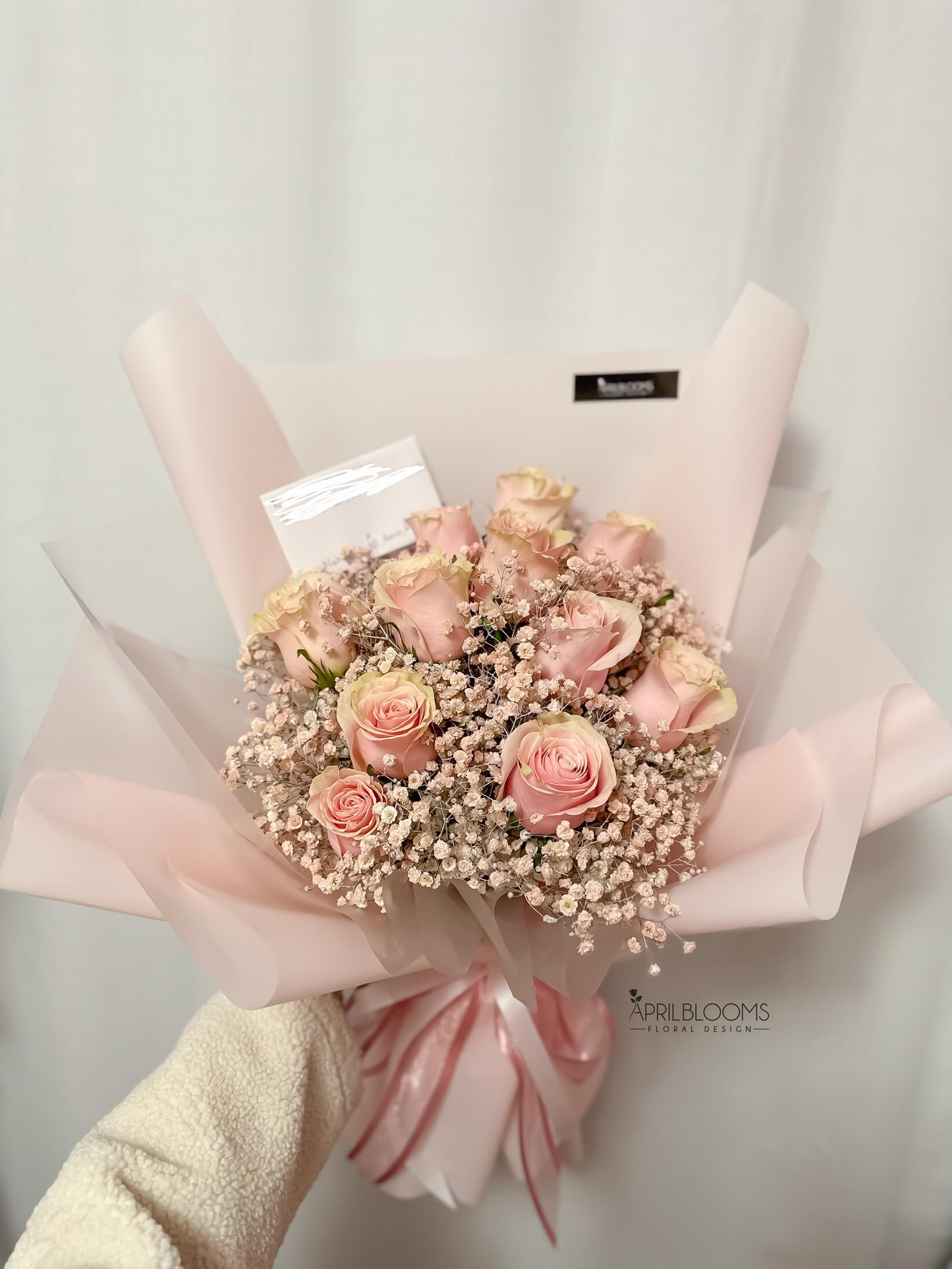 1 dozen pink roses and pink baby's breath wrapped in pink and translucent waterproof papers.