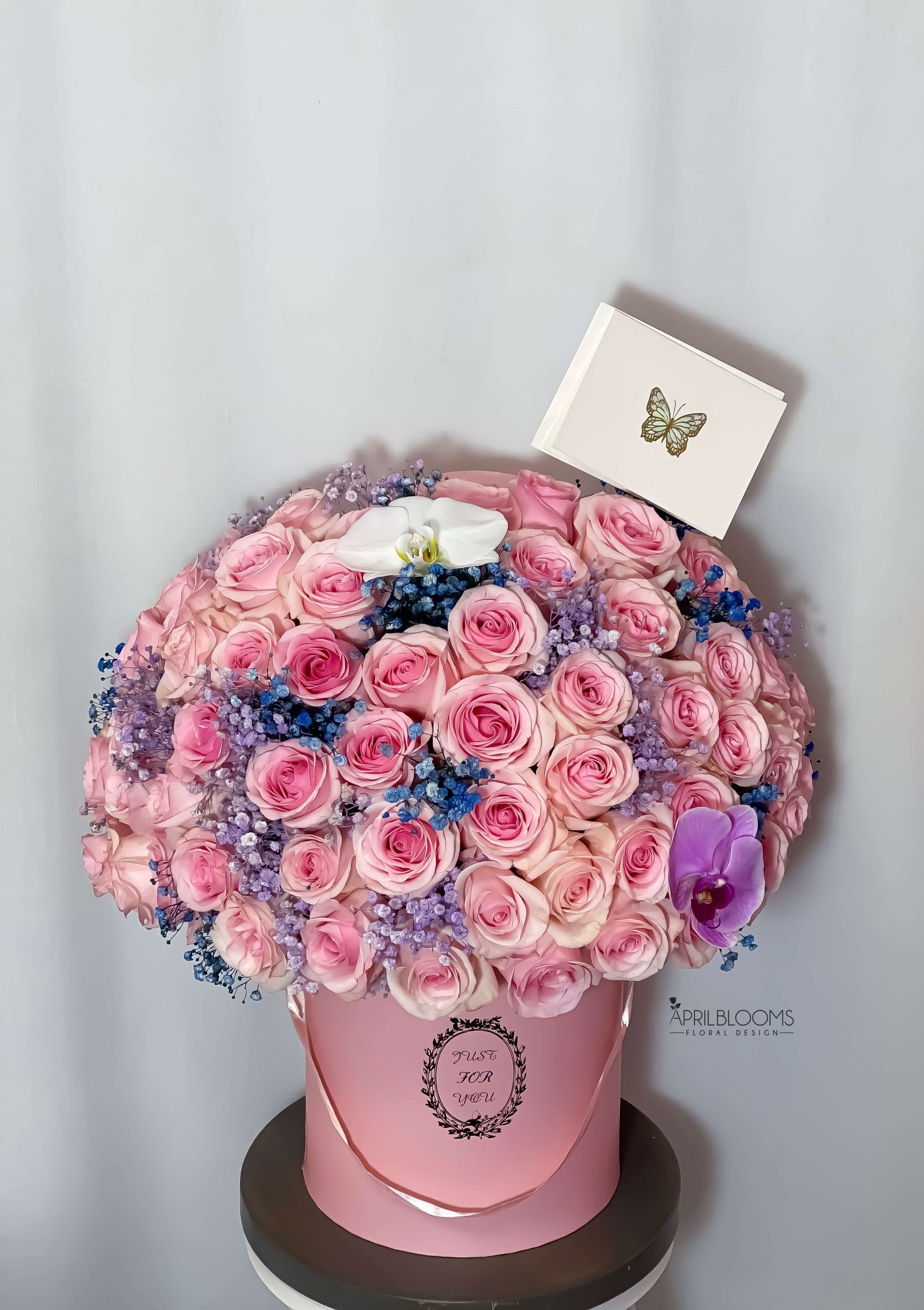 6 dozens of roses, purple and blue baby's breath, orchids in a box.