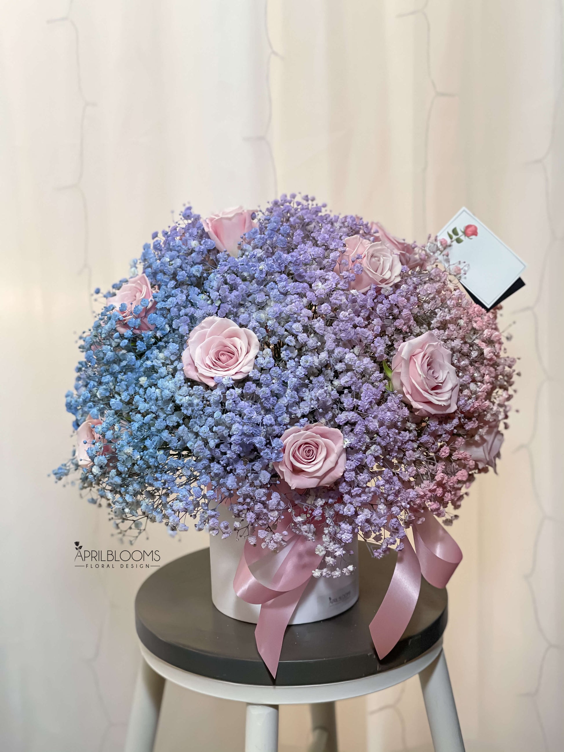Roses, ombre blue-purple-pink baby's breath in a box.