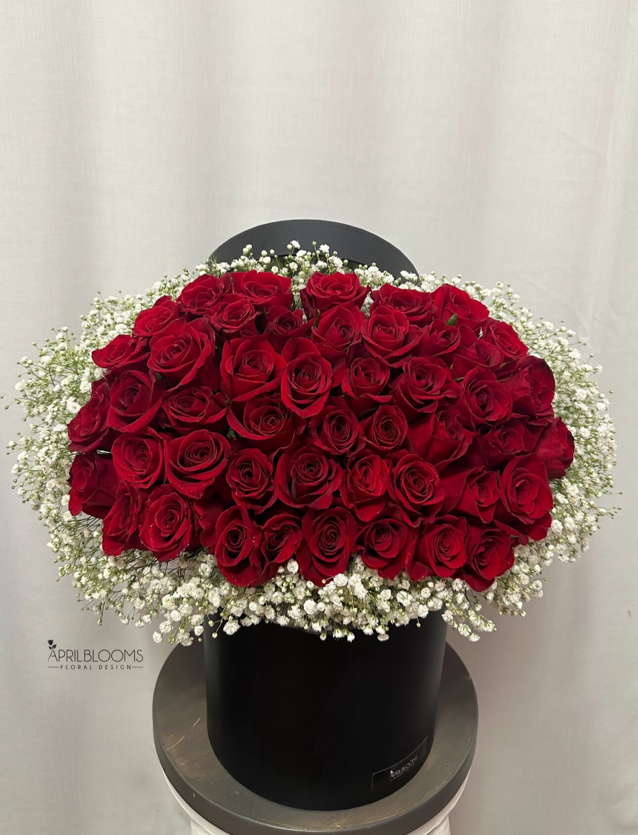 50 roses and baby's breath in a box.