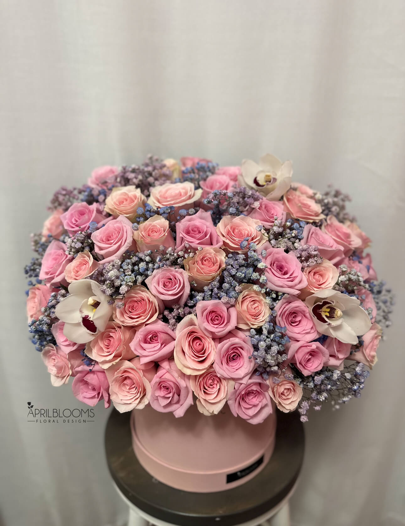 50 roses, orchids and baby's breath in a box.